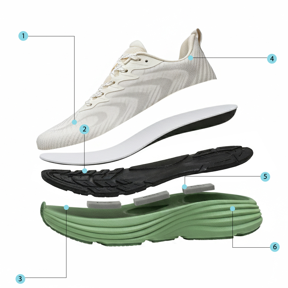 Rebound and Cushioning: Tailoring sole comfort with dual EVA densities - 58% degree for firmness of soles, 53% degree for flexibility of forefoot.