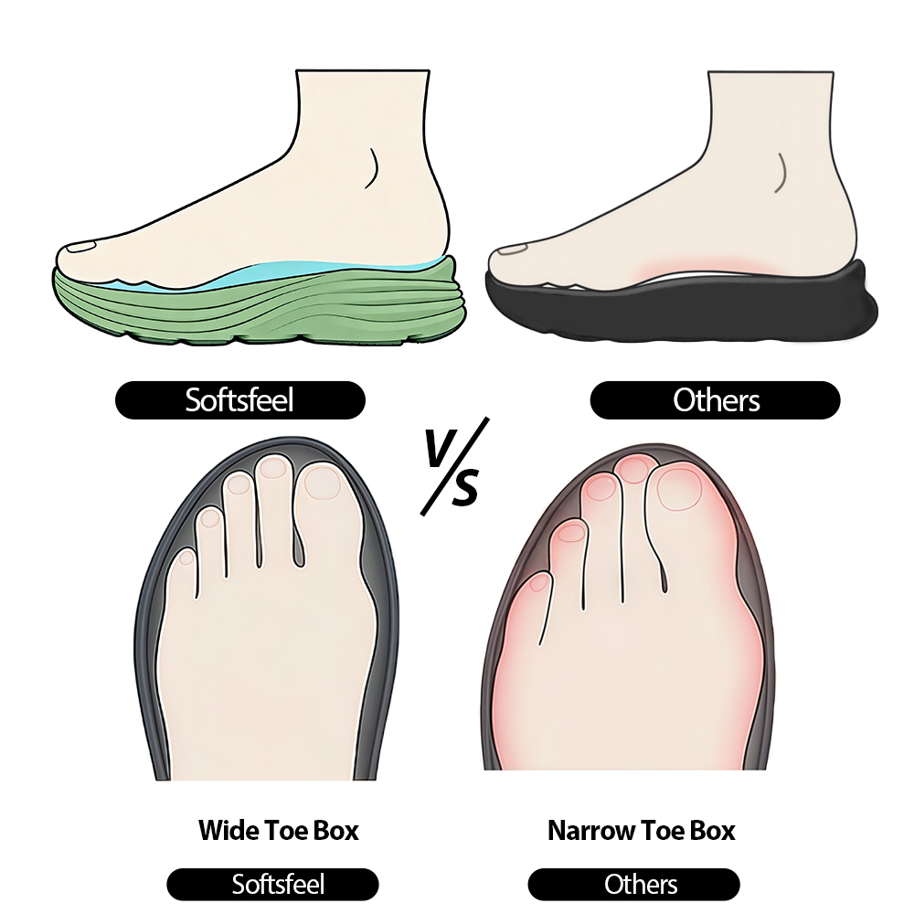 Softsfeel's Rebound Core® Shoes: guarantee 8 hours of fatigue-free walking and standing! These podiatrist-approved sneakers will put you in comfort all day long! Bid farewell to cramped toes as our extra-wide forefoot area boosts blood circulation. Even when fatigue sets in, our innovative heel ring maintains consistent gait posture, keeping you steady on your feet.